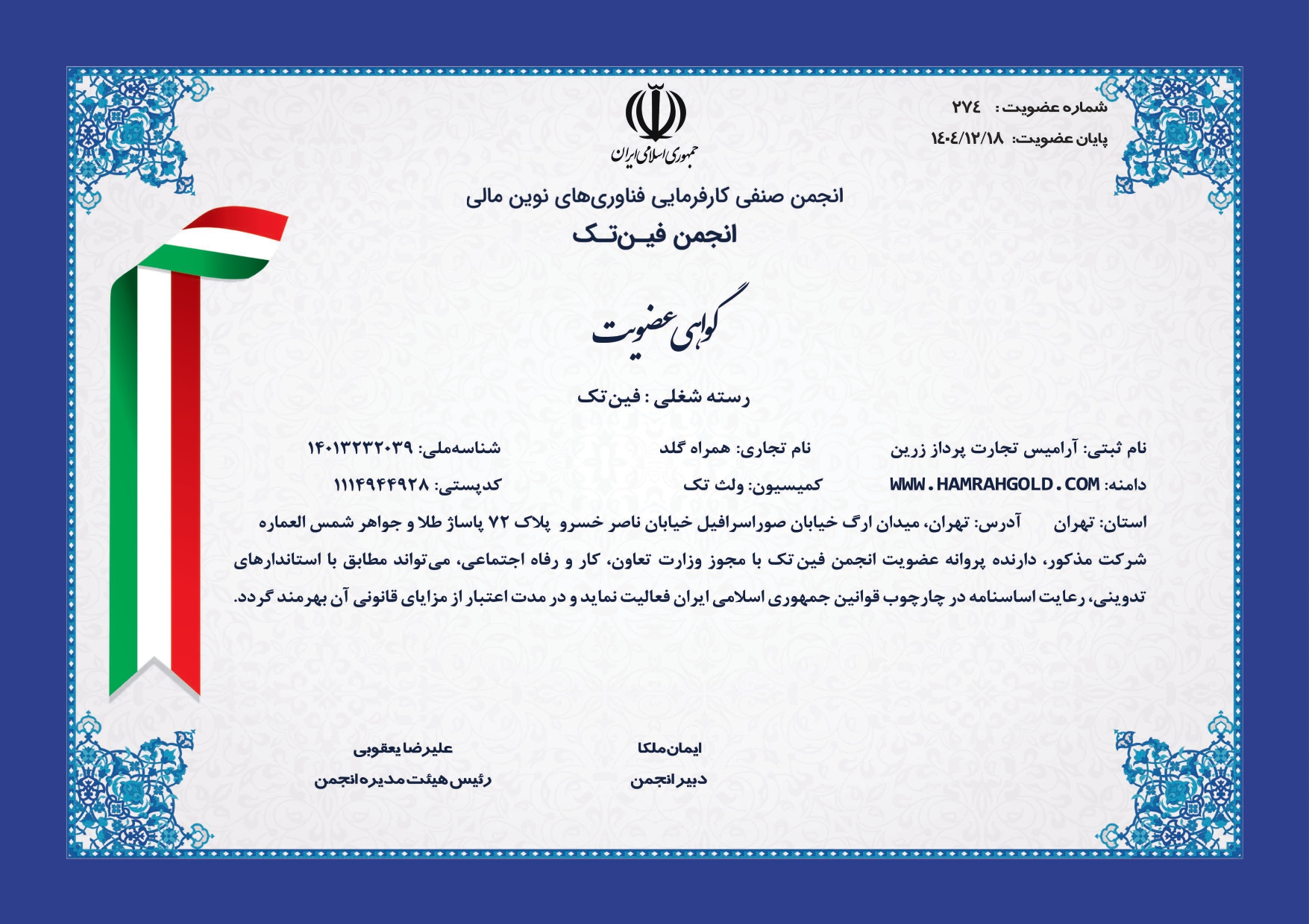 همراهگلد عضو رسمی انجمن فینتک ایران است. این عضویت گواه تعهد ما به نوآوری، شفافیت، و همکاری با نهادهای تخصصی در حوزه فناوریهای مالی است.